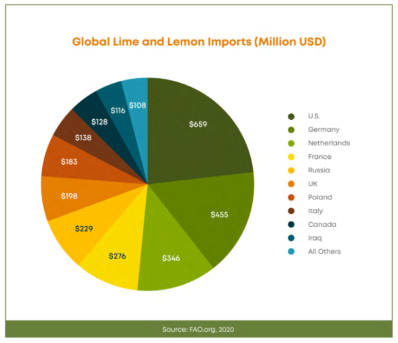 The nation's farmers have achieved a 450 percent increase in lemon and lime exports since 2015. In 2020, its export revenue hit $32 million for these citrus fruits, and present estimates show a potential growth rate of 20 percent per year for limes.